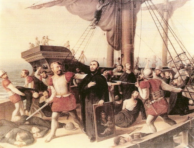 E no Brasil? Encontra-se facilmente nas enciclopédias que, os protestantes calvinistas em 15 de julho de 1570, mataram 40 jesuítas, entre eles Inácio de Azevedo, morto a CUTILADAS (golpe de espada) quando, segurando num quadro da Virgem Maria, animava a tripulação a resistir ao ataque protestante, que degolou a todos (Enc. Microsoft Encarta 99, verbete: “Inácio de Azevedo, beato”).